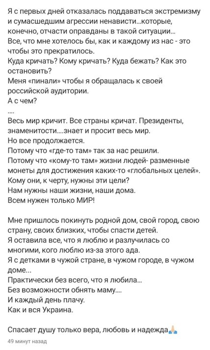 Лише на 26-й день війни на своїй новій сторінці в Інстаграм блогер опублікувала посаду, в якій висловила свою позицію і пояснила своє тритижневе мовчання про війну.