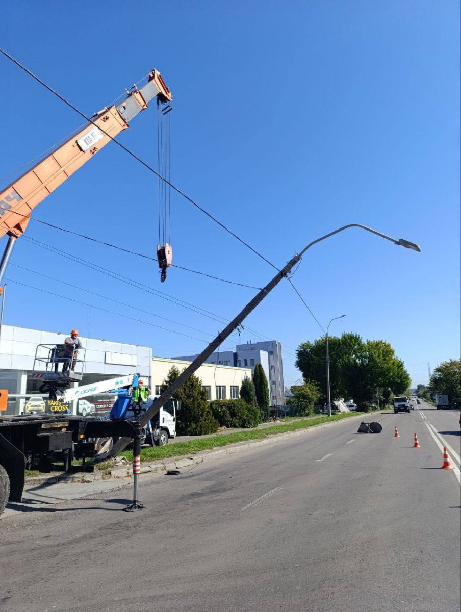 На вулиці Млинівській у Рівному працівники КП "Міськсвітло" замінили пошкоджену внаслідок ДТП залізобетонну електроопору, встановили кронштейн і світильник та перетягнули 70 м СІПа (самонесучого ізольованого провода).