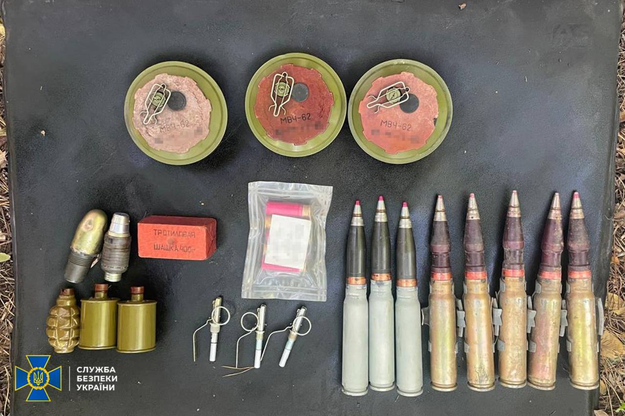 - Під час обшуку зі схрону вилучили ще 8 артпострілів та 4 бойові гранати, одна з них до підствольного гранатомета, 3 підривачі до протитанкової міни, артилерійський снаряд та тротилову шашку, - повідомляє СБУ.